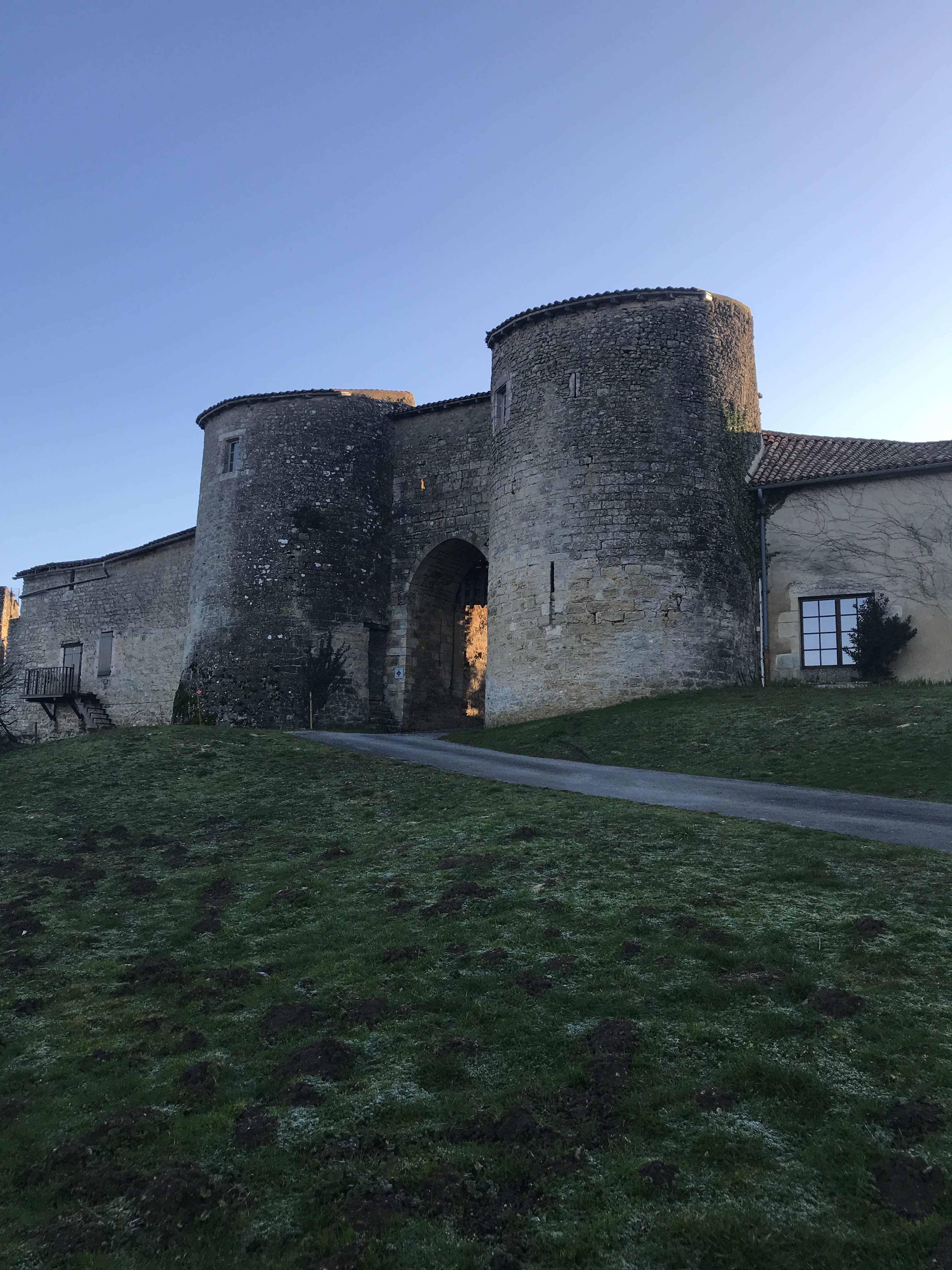 Beau levé de soleil sur le château et givre. Nous regagnons la salle des fêtes, le temps se couvre.